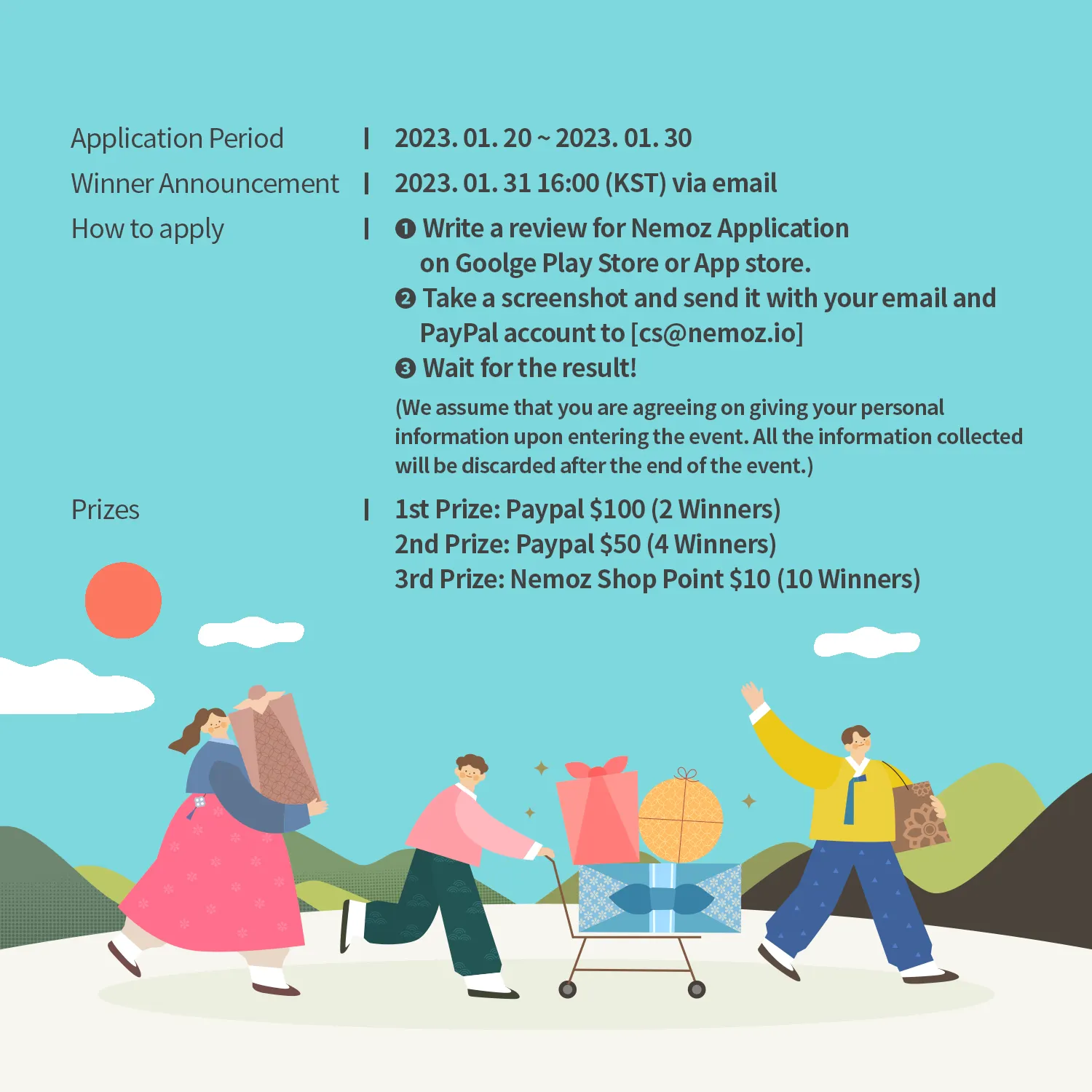 We are holding “Nemoz App Review” event to give back the love we have received last year, for the coming Seollal (Korean New Year).